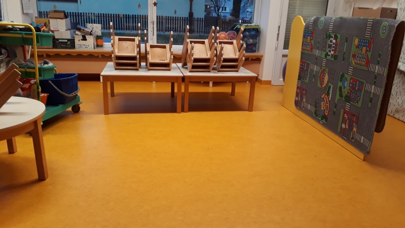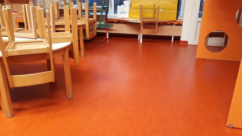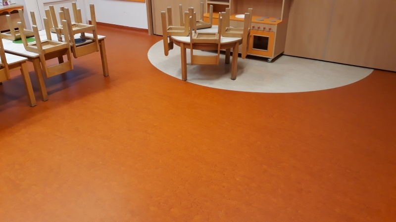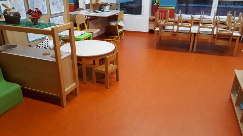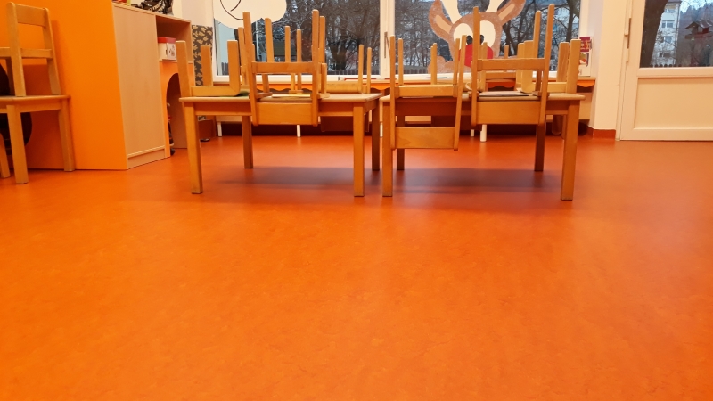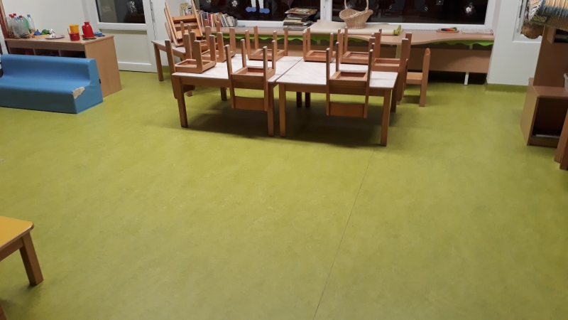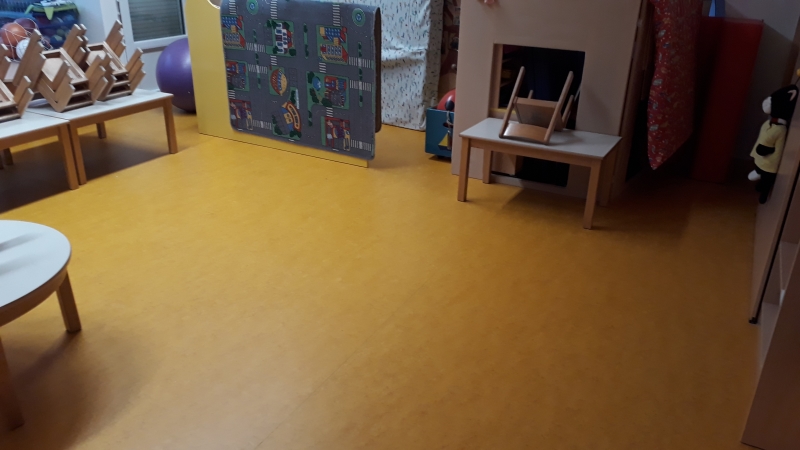 V vrtcu, enota Mehurček Ljubljana, smo zamenjali dotrajane vinilne talne obloge. Vgradili smo visokokakovostni linolej Marmoleum Forbo decibel, kateri ima dodatno akustično podlogo. Ta da talni oblogi tudi dodatno mehkobo (večji del otroške igre v vrtcu poteka na tleh).